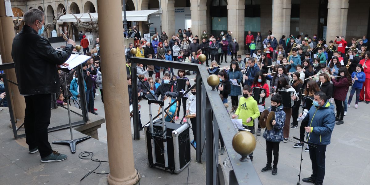 Ayer por la tarde, atendiendo a la convocatoria conjunta realizada por la Asociación de Escuelas de Música de Navarra se realizó un acto en la plaza bajo el lema “Unión por la Paz”, donde el alumnado del centro, apoyado por sus familias y docentes, interpretó la “Oda a Europa”.