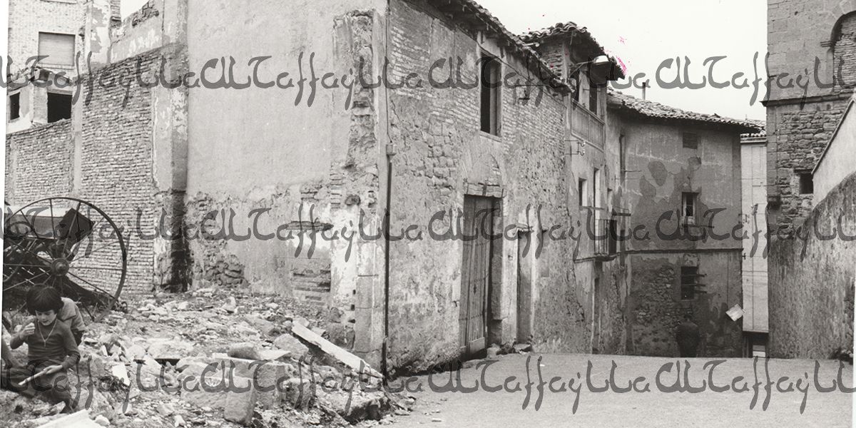 La casa de los condes de Guendulain y las Recoletas fueron el primer ensanche de Tafalla, más allá del cerco de sus murallas. Luego hubo otras construcciones, como estas situadas en la Cuatropea, lugar de la feria de ganado desde muy antiguo. Las casas desaparecieron para dar paso al jardín actual. Al fondo, la casa de Malamadera, la última en desaparecer.