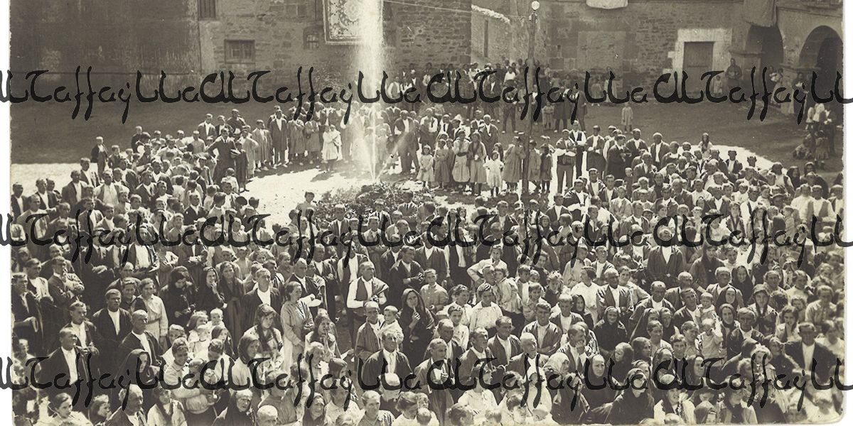 Año 1918. Larraga celebra la traída de las aguas. Se acabó el ir a lavar al río o a traer agua de las fuentes. Los hombres se han quitado las boinas, en señal de respeto.
